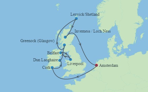 Hajó útvonala III.: Amszterdam - tengeren - Waterford, Írország - tengeren - Dan Laoghaire, Írország - Liverpool - Belfast - Greenock - tengeren - Lerwick, Skócia - Inverness - tengeren - Amszterdam
