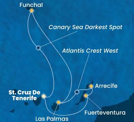 Hajó útvonala: Teneriffe, Kanári-szigetek (2 nap) - Fuertaventura, Kanári-szigetek - tengeren - Funchal, Madeira - Las Palmas, Kanári-szigetek - Arrecife, Kanári-szeigetek - Teneriffe, Kanári-szigetek
