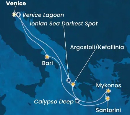Hajó útvonala: Velence - Bari - tengeren - Szantorini - Mikonosz - Kefalónia - tengeren - Velence