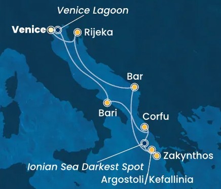 Hajó útvonala: Velence - Bari - Korfu - Zakinthos - Kefalónia - Bar, Montenegro - Rijeka - Velence
