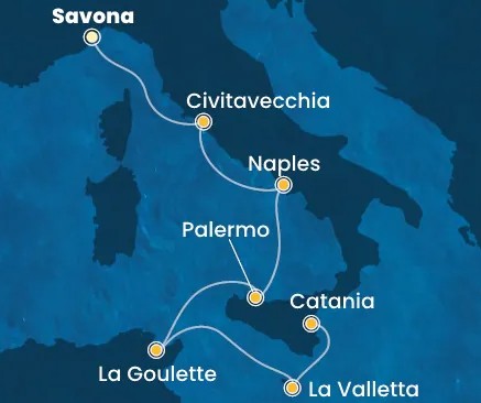 Hajó útvonala: Savona - Marseille - Barcelona - tengeren - La Goulette, Tunézia - Palermo, Szicília - Civitavecchia (Róma) - Savona