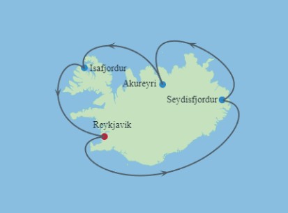 Hajó útvonala: Reykjavik, Izland - Tengeren -Seydisfjordur, Izland -Akureyri, Izland -Isafjordur, Izland - Tengeren - Reykjavík, Izland (2 nap)