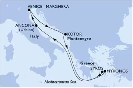 Hajó útvonala: Velence - Kotor, Montenegro - tengeren - Mykonos - Syros- tengeren - Ancona - Velence