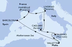 Hajó útvonala: Livorno - Cagliari, Szardínia - Palemo, Szicília - La Valletta, Málra - tengeren - Barcelona - Marseille - Livorno
