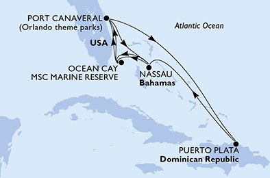 - Canaveral (Orlando-Florida) -> At Sea -> At Sea -> Puerto Plata Dominican Republic -> At Sea -> Nassau Bahamas -> Ocean Cay MSC Marine Reserve Bahamas -> PortCanaveral United States -> Nassau Bahamas -> Ocean Cay MSC Marine Reserve Bahamas -> Ocean Cay MSC Marine Reserve Bahamas -> PortCanaveral United States
