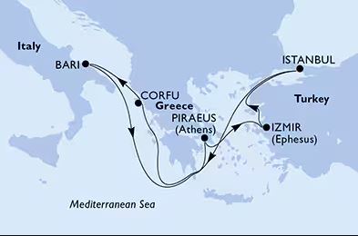 Hajó útvonala: Bari - tengeren - Szantorini - Athén (Pireusz) - Katakolon (Olympia) - Kefalónia - Korfu - Bari