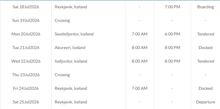 A hajó útvonala: Reykjavík- Tengeri nap-Seydisfjordur-Akureyri-Isafjordur-Tengeri nap-Reykjavík- Reykjavík