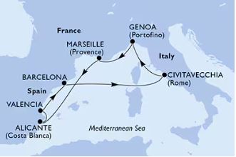 Hajó útvonala: Genova - Livorno - Civitavecchia (Róma) - tengeren - Valencia - Barcelona - Marseille - Genova