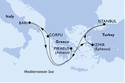 Hajó útvonala: Athén (Pireus) - Izmir (Epheszosz) - Isztambul - tengeren - Korfu - Bari - tengeren - Athén (Pireusz)