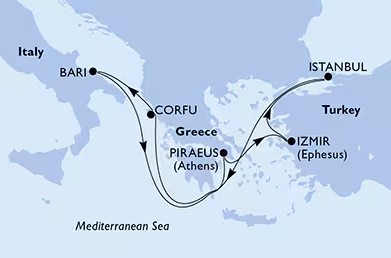 Hajó útvonala: Bari - tengeren - Athén (Pireusz) - Izmir - Isztambul - tengeren - Korfu - Bari