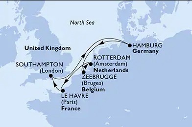 Hajó útvonala: Hamburg - tengeren - Zeebrugge - Rotterdam - Le Havre - Southampton - tengeren - Hamburg