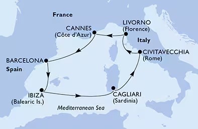 Hajó útvonala: Barcelona - Ibiza - tengeren - Cagliari, Szardínia - Civitavecchia (Róma) - Livorno - Cannes - Barcelona