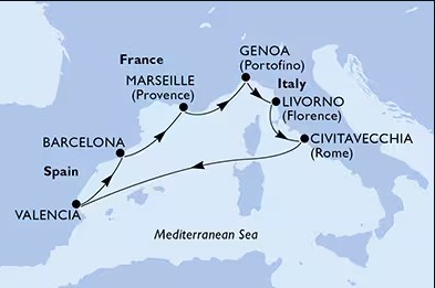 Indulási és érkezési kikötők: Genova, Livorno, Róma,Olaszország vagy Valencia, Barcelona