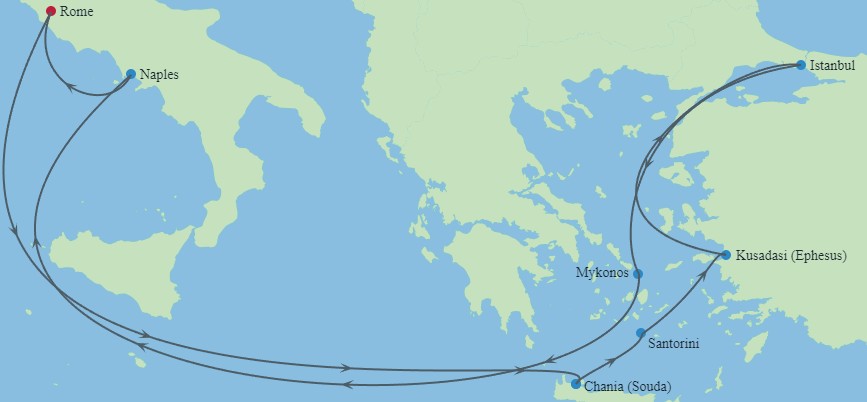Hajó útvonala: Róma (Civitavechhia) - tengeren - Szantorini - Kusadasi (Epheszosz) - Mykonos - tengeren - Nápoly - Róma (Civitavecchia)