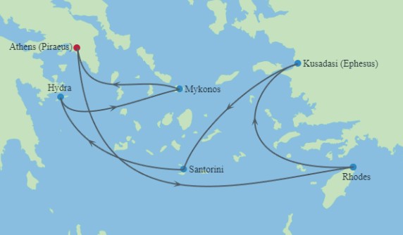 Hajó útvonala II.: Athén (Pireusz) - tengeren - Rodosz - Kusadasi (Epheszosz) - Szantorini - Hydra - Mykonos - Athén (Pireusz)